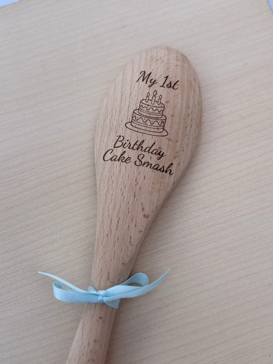 First Birthday Cake Smash Wooden Spoon | Engraved Keepsake with Ribbon – Pink, Purple, Green or Blue