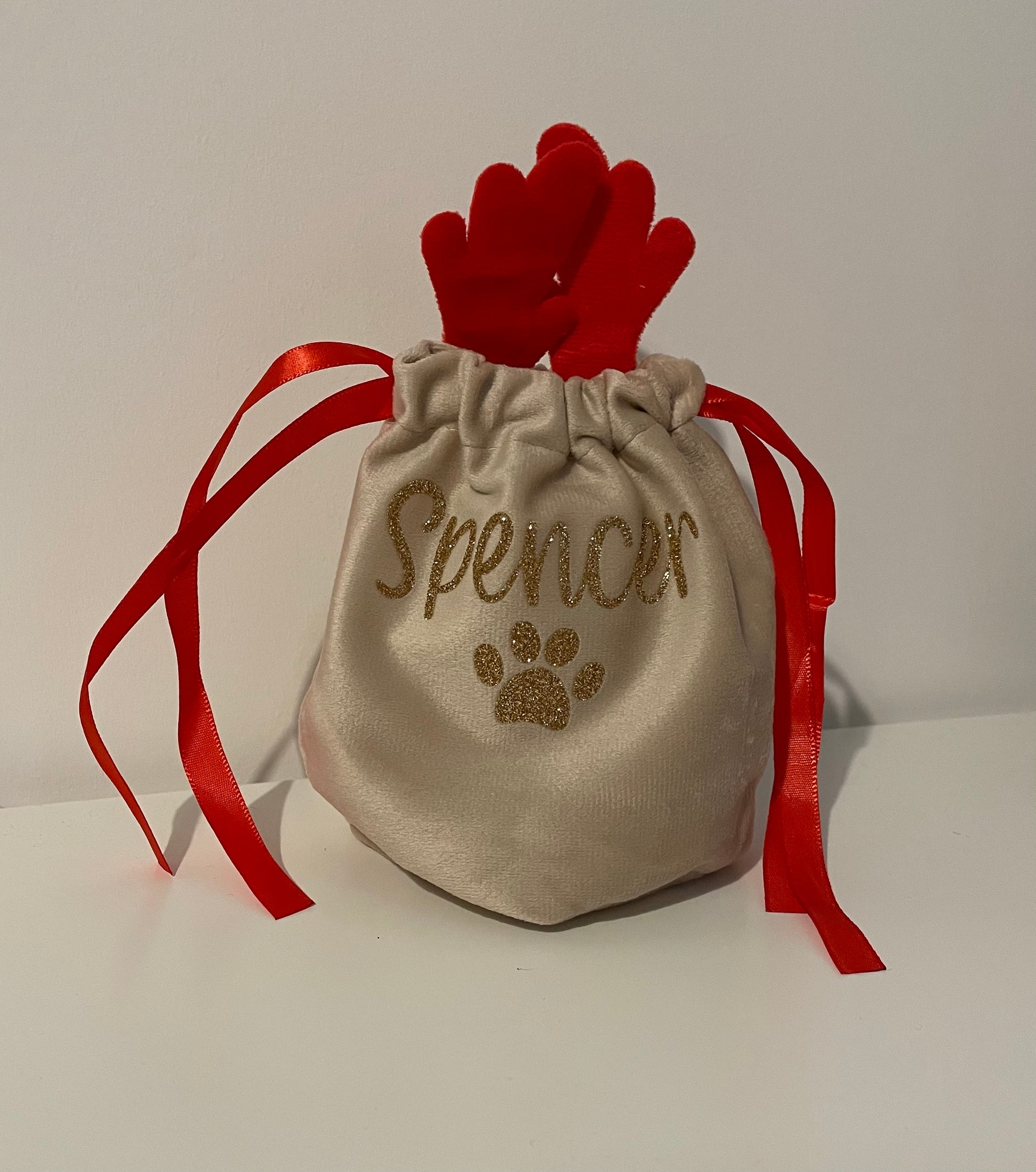 These festive Reindeer Treat Bags add a touch of magic to your holiday celebrations. Made of soft velvet style material and complete with adorable reindeer ears, they can be personalised in gold glitter with a name of your choice. Perfect for giving Christmas treats or small gifts to your loved ones. Choose between red or brown ears.